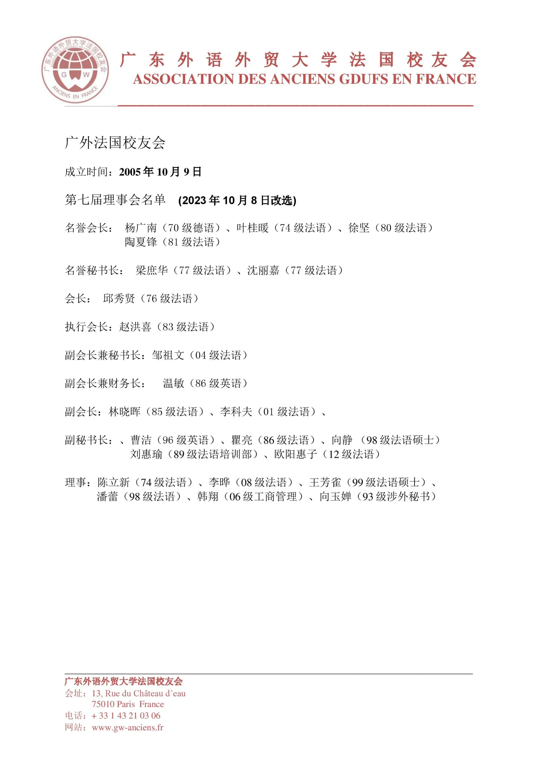 名誉秘书长:梁庚华(77级法语)、沈丽嘉(77级法语)