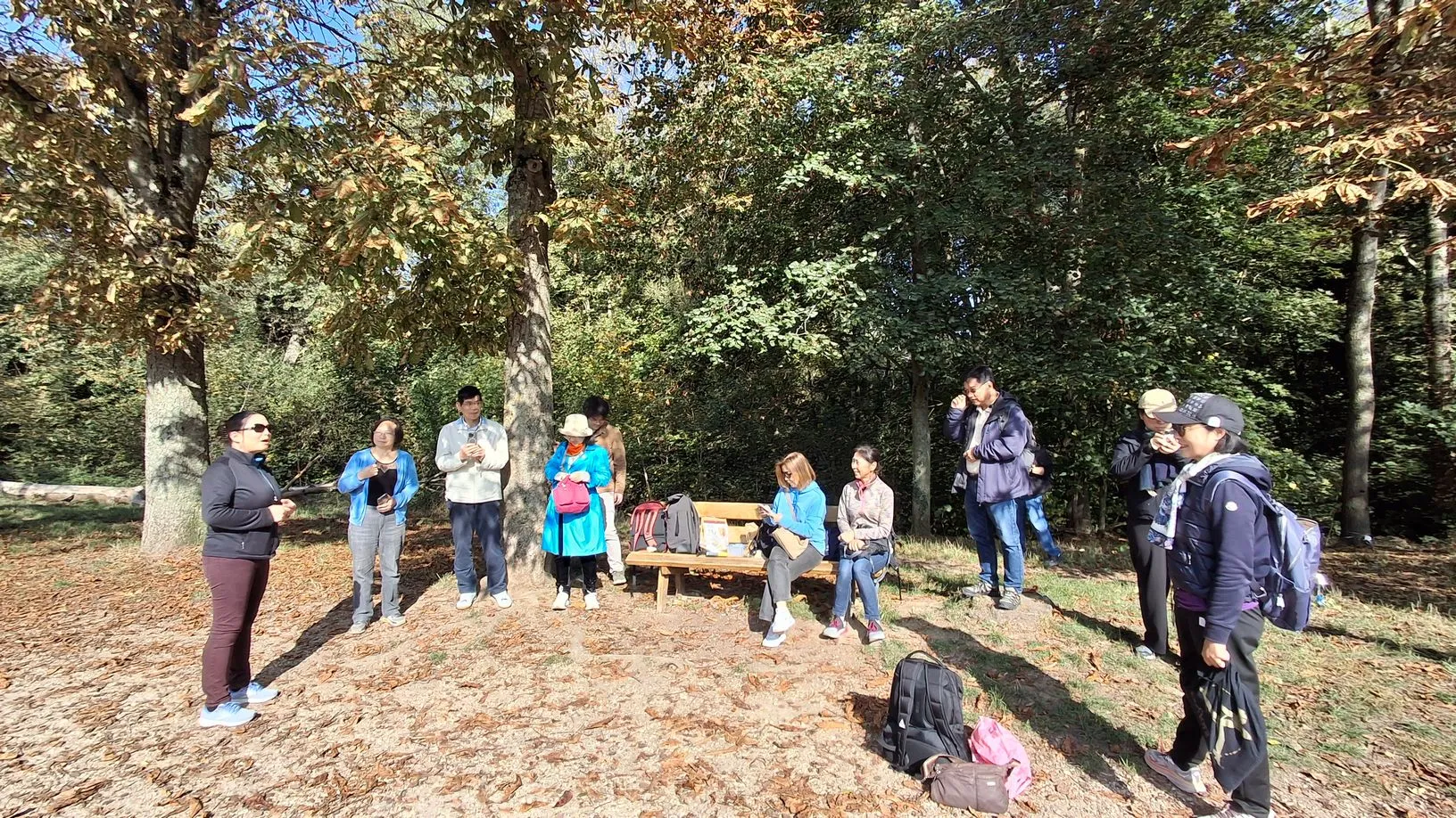 活动当日,阳光和煦,Malmaison森林层林尽染,秋意盎然。校友们从巴黎市区及周边汇聚而来,在组织者的带领下分组行动,沿森林小径漫步,一边欣赏自然风光,一边搜寻散落的栗子。大家手持工具,互相协作,欢声笑语间满载而归。