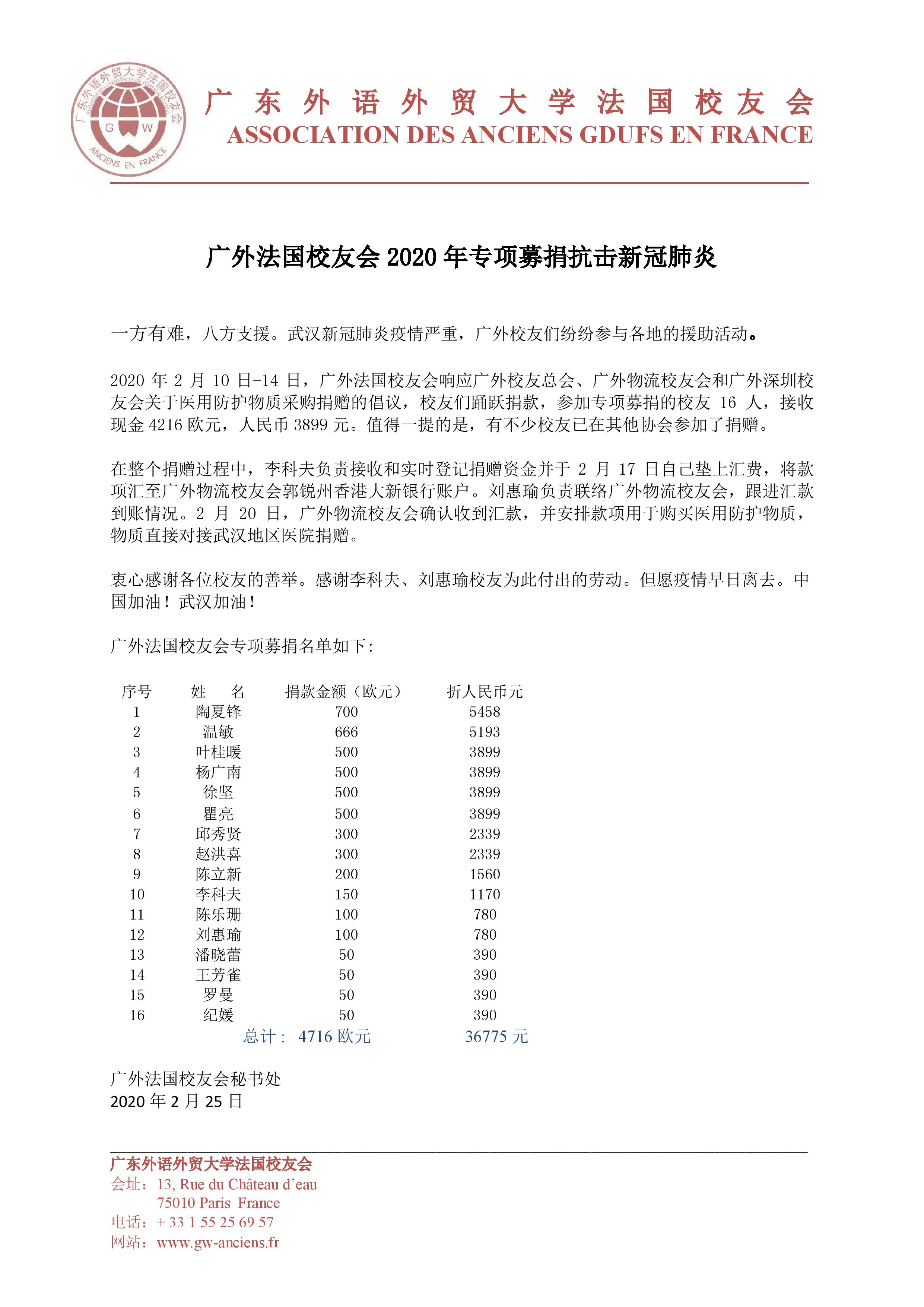 广外法国校友会2020年专项募捐抗击新冠肺炎